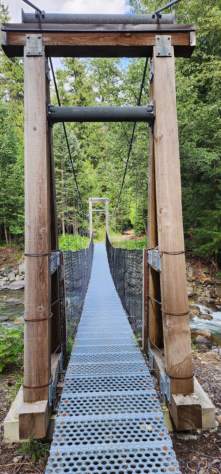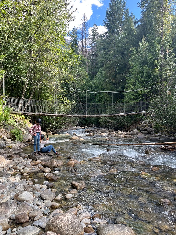After lunch by the turquoise lake in front of Mt. Birkenhead, we continued up the trail, getting a few more canters in. The trail was like a rollercoaster, filled with dips into ditches where streams flowed, and took us past a birch tree that bore the marks of a climbing bear’s claws to a small suspension bridge. We crossed the narrow metal bridge on foot and filled our water bottles from the clear river below.